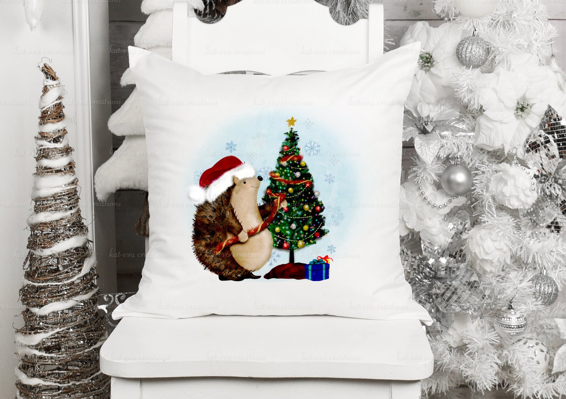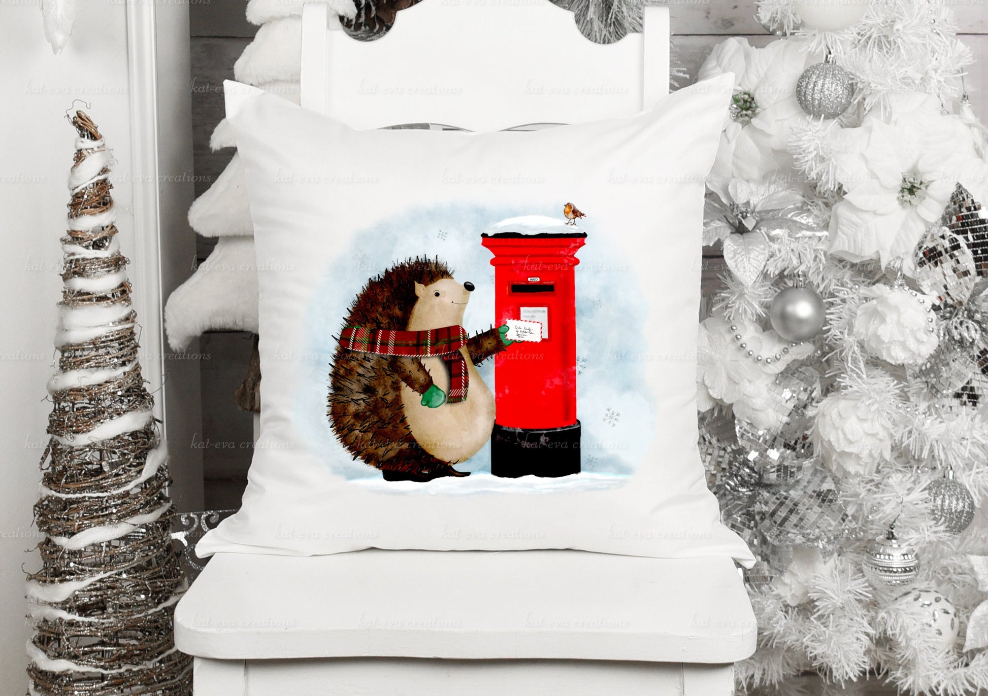 Christmas hedgehog cushion. Can be personalised. choice of with postbox or tree