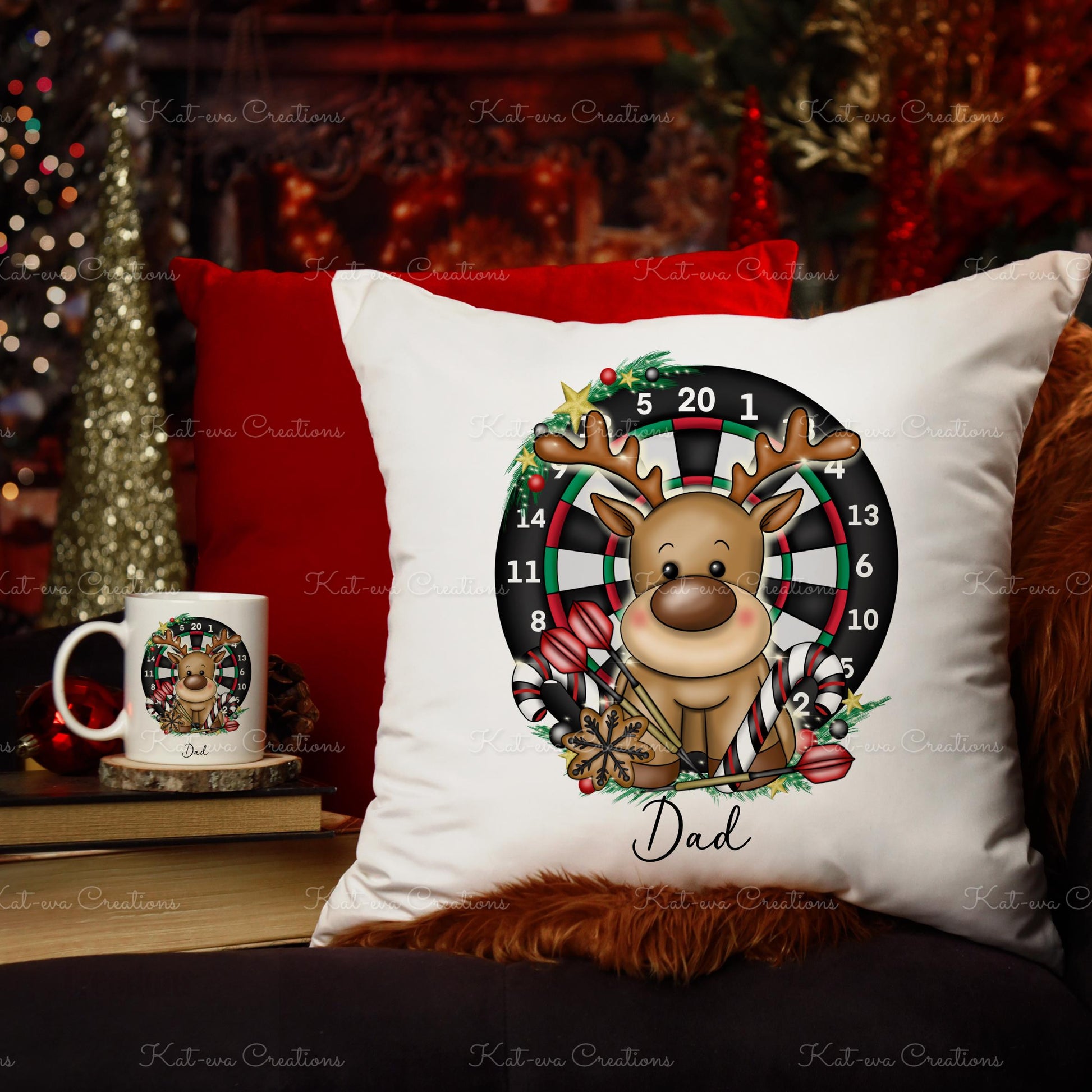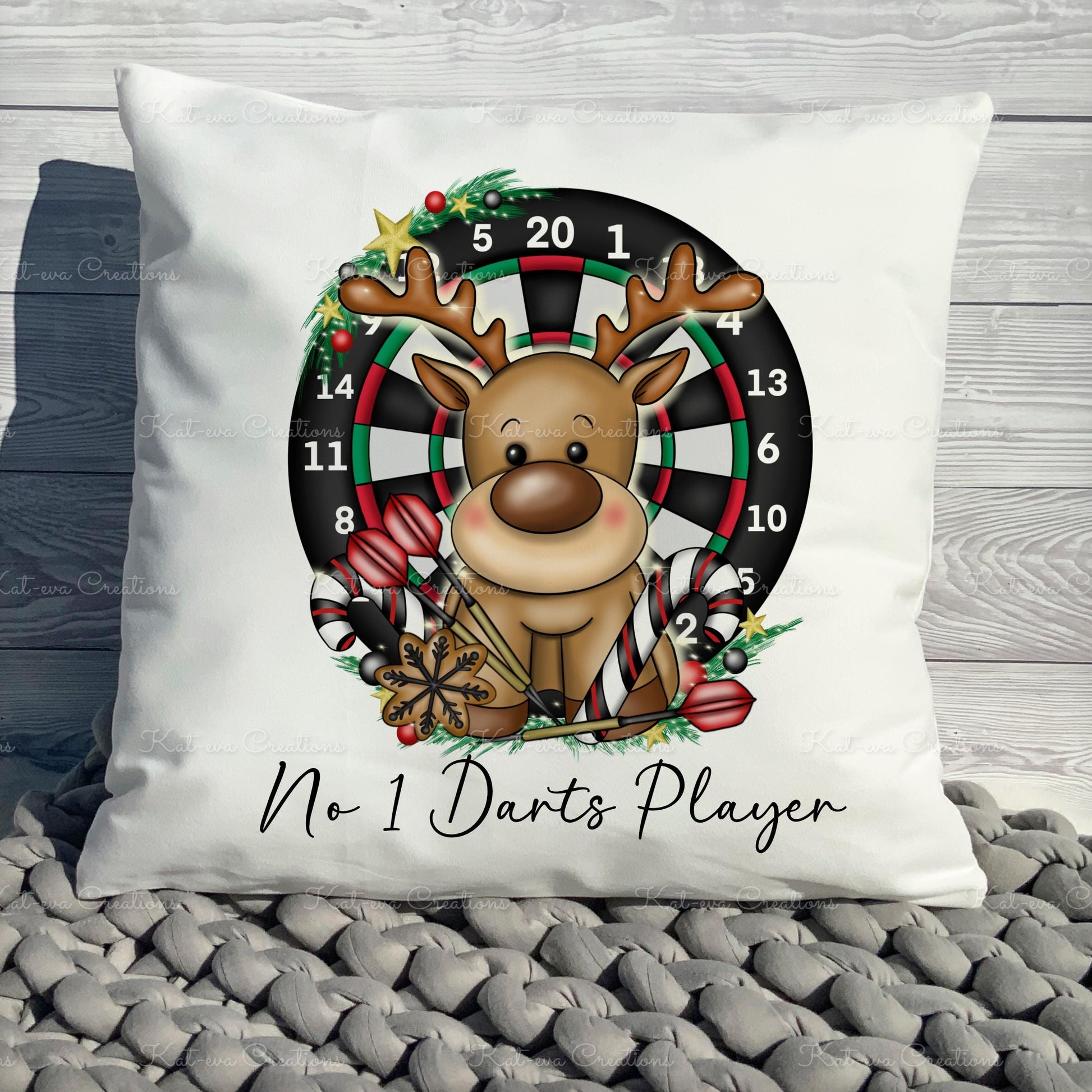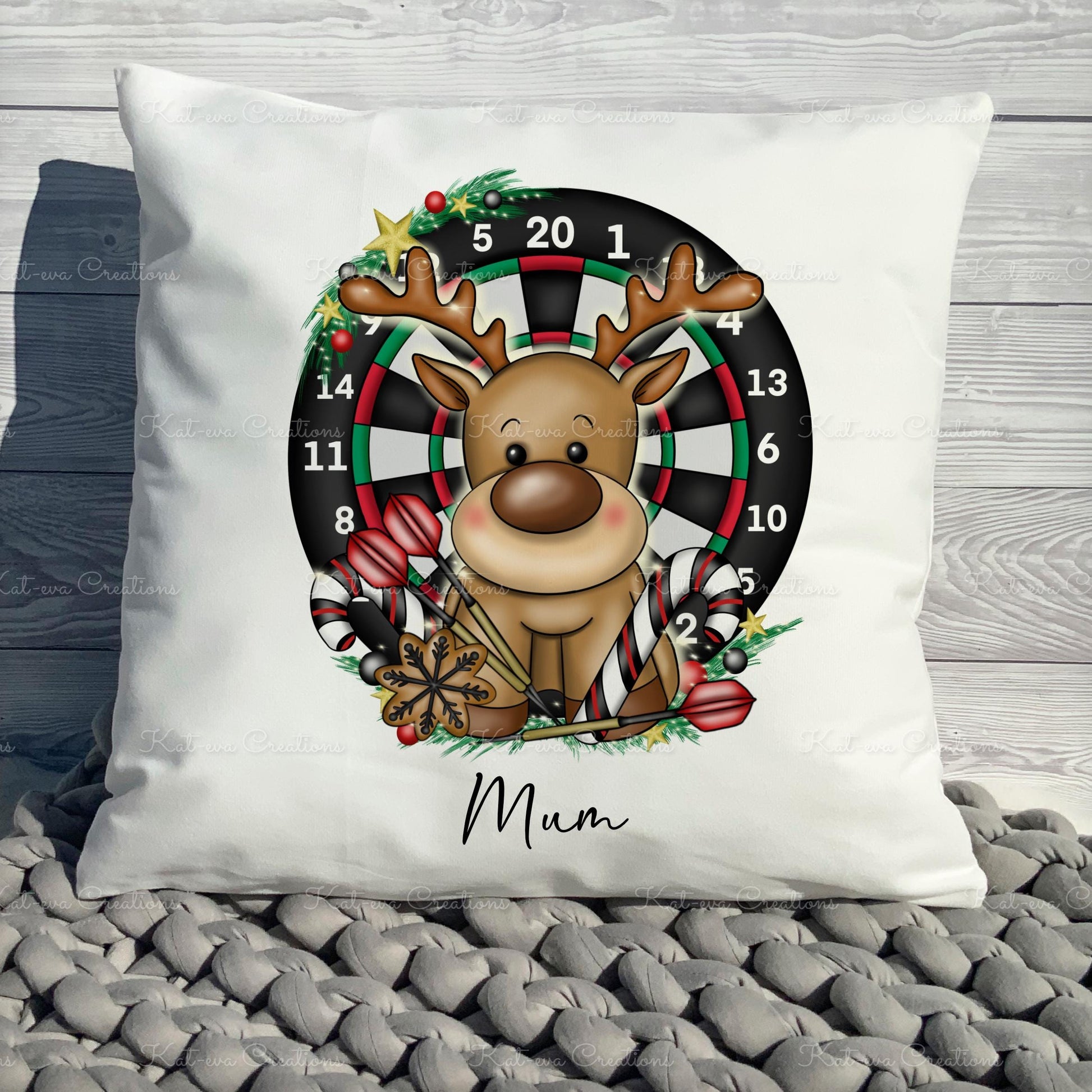 dart player reindeer cushion. personalised darts cushion. ideal christmas or secret santa gift or as a thank you present