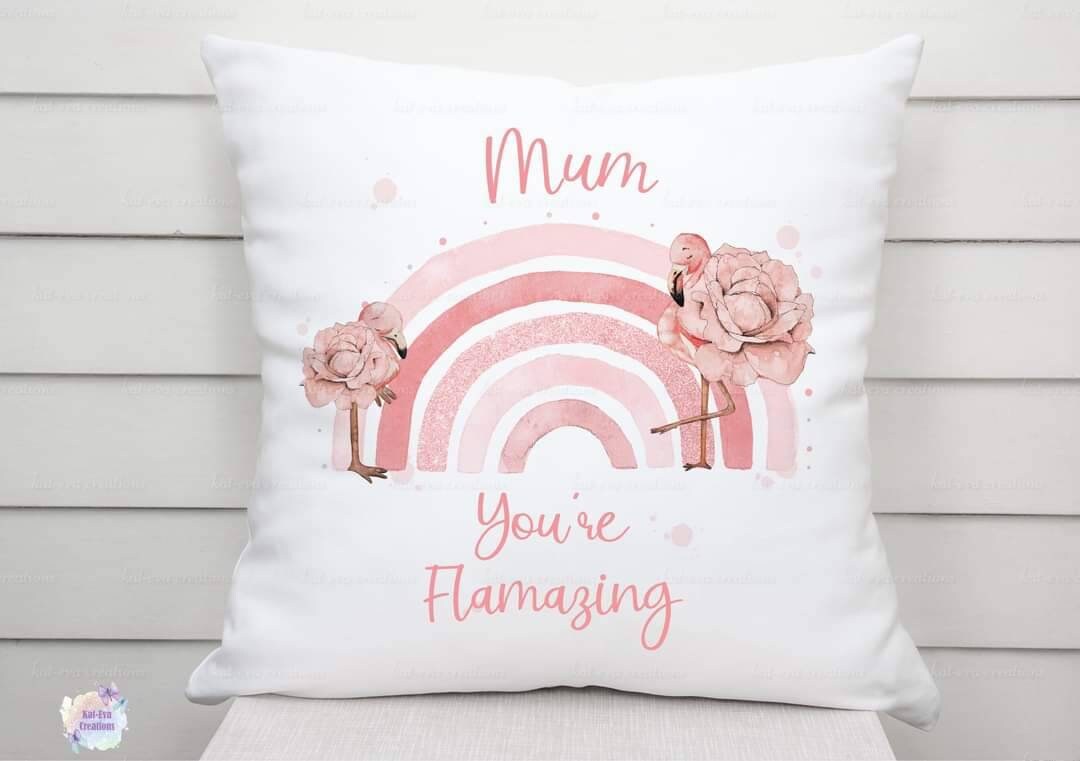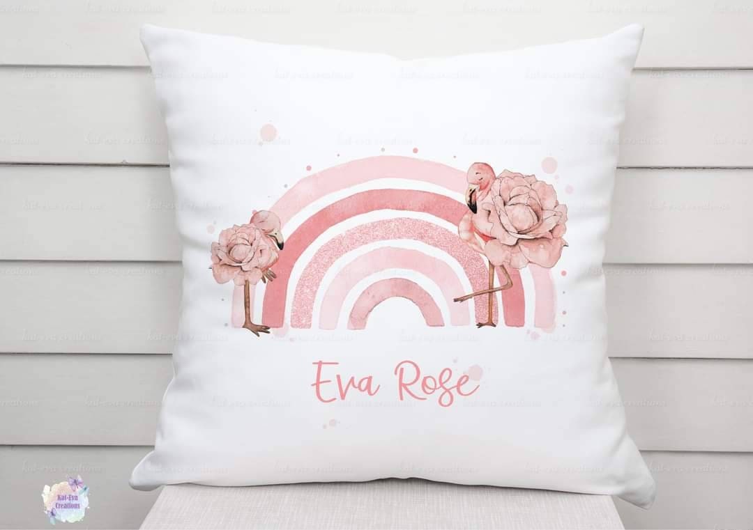 Gorgeous flamingo rainbow cushion. can be personalised. ideal for mothers day