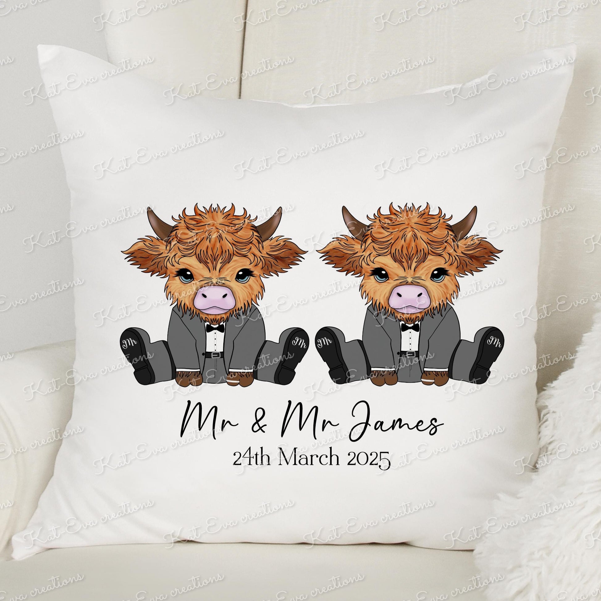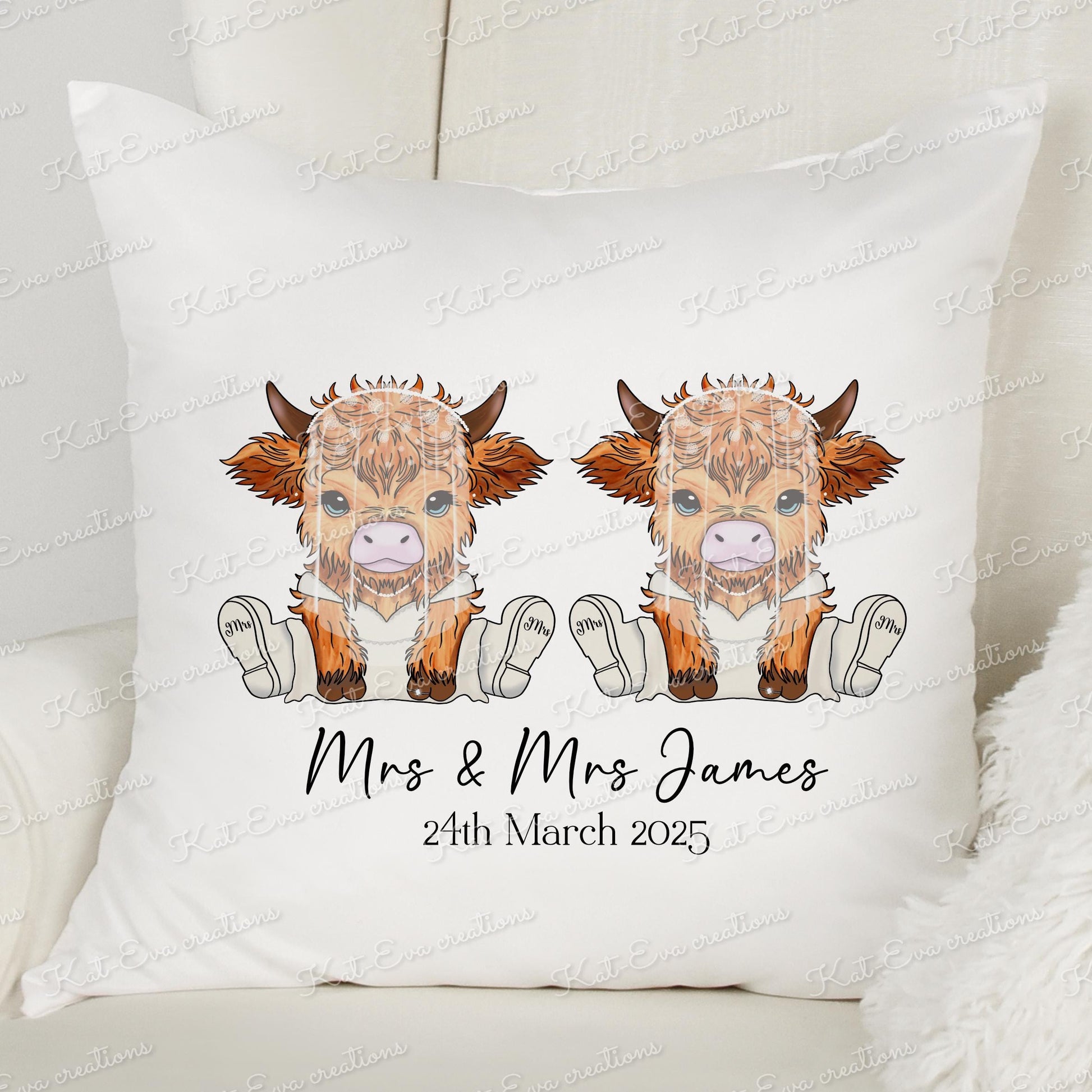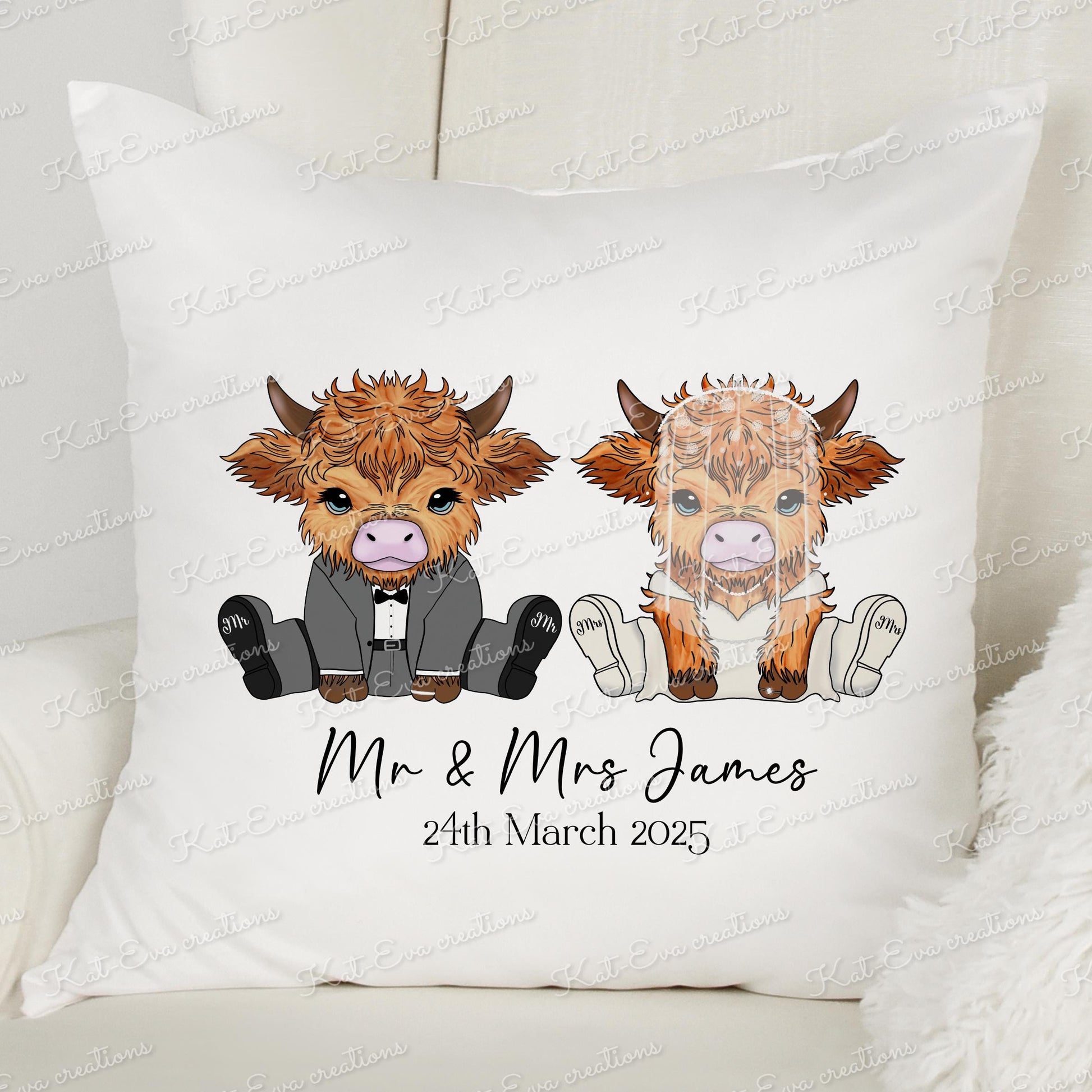 Highland cow Wedding cushion. Personalised cushion. Engagement, wedding or anniversary cushion Highland cow congratulations. highland coo