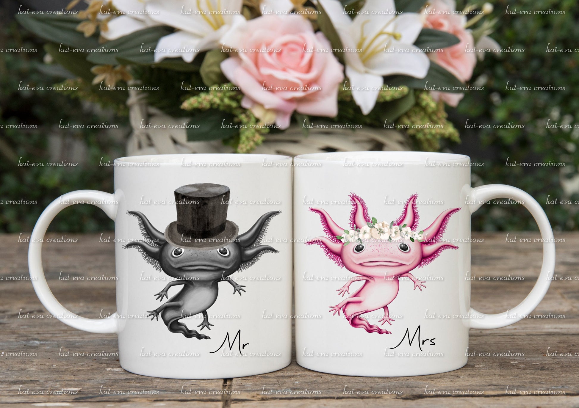 mr and mrs axolotl mugs available, ideal wedding, anniversary present. can be made as mr and mr or mrs and mrs as well.
