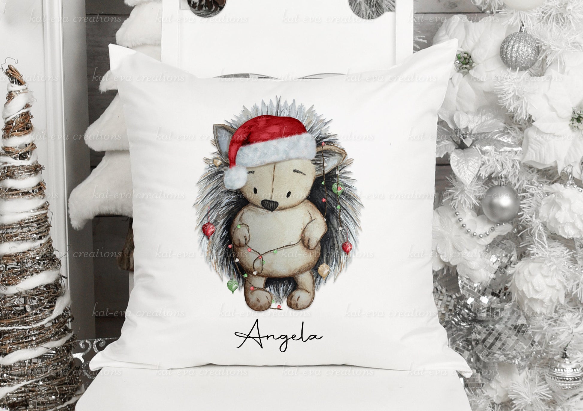 personalised hedgehog cushion, Christmas hedgehog pillow