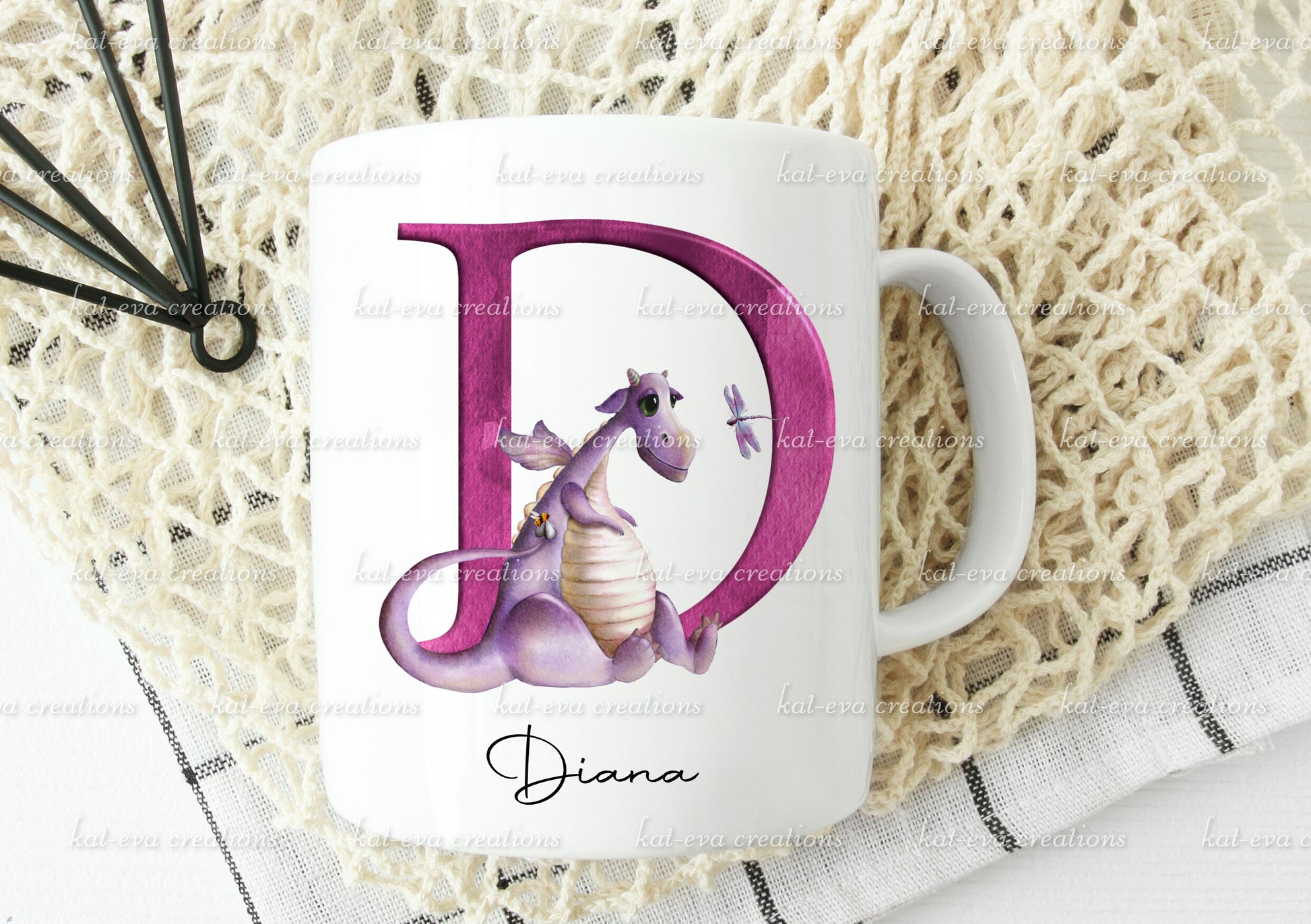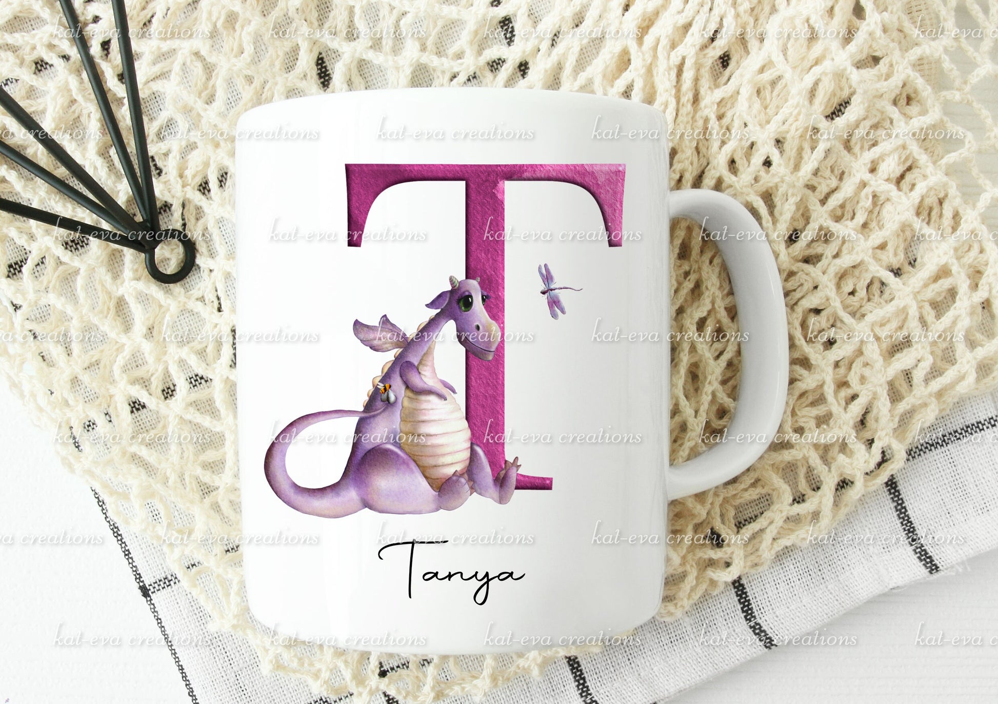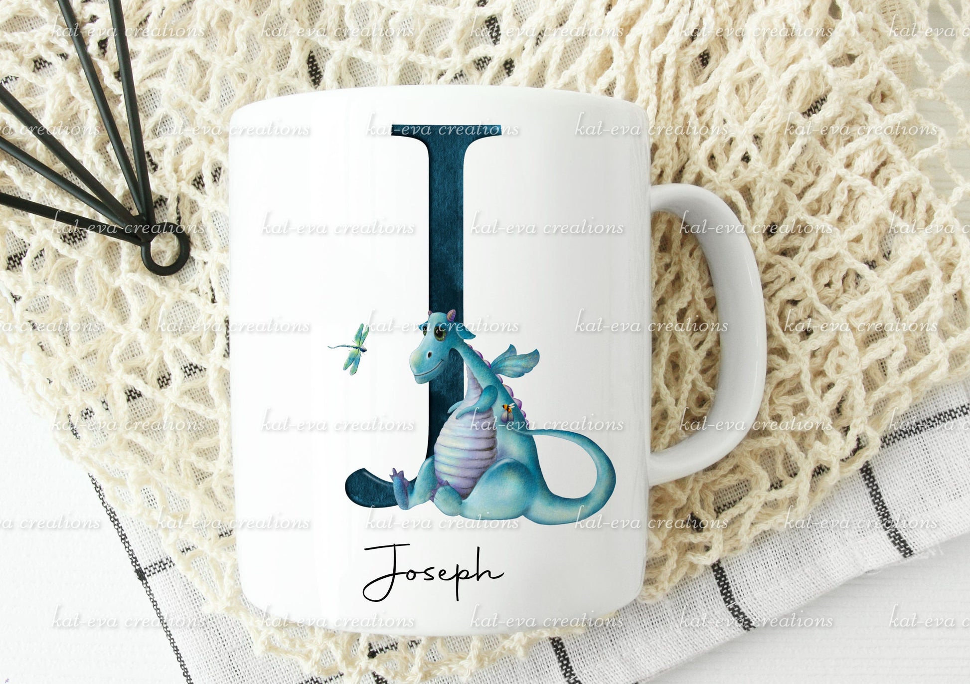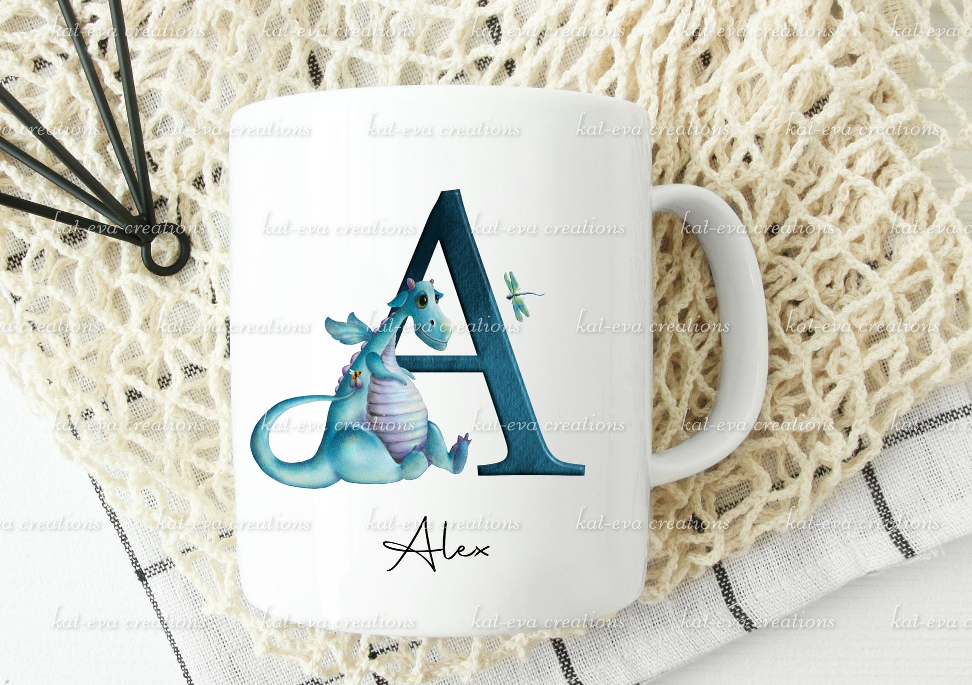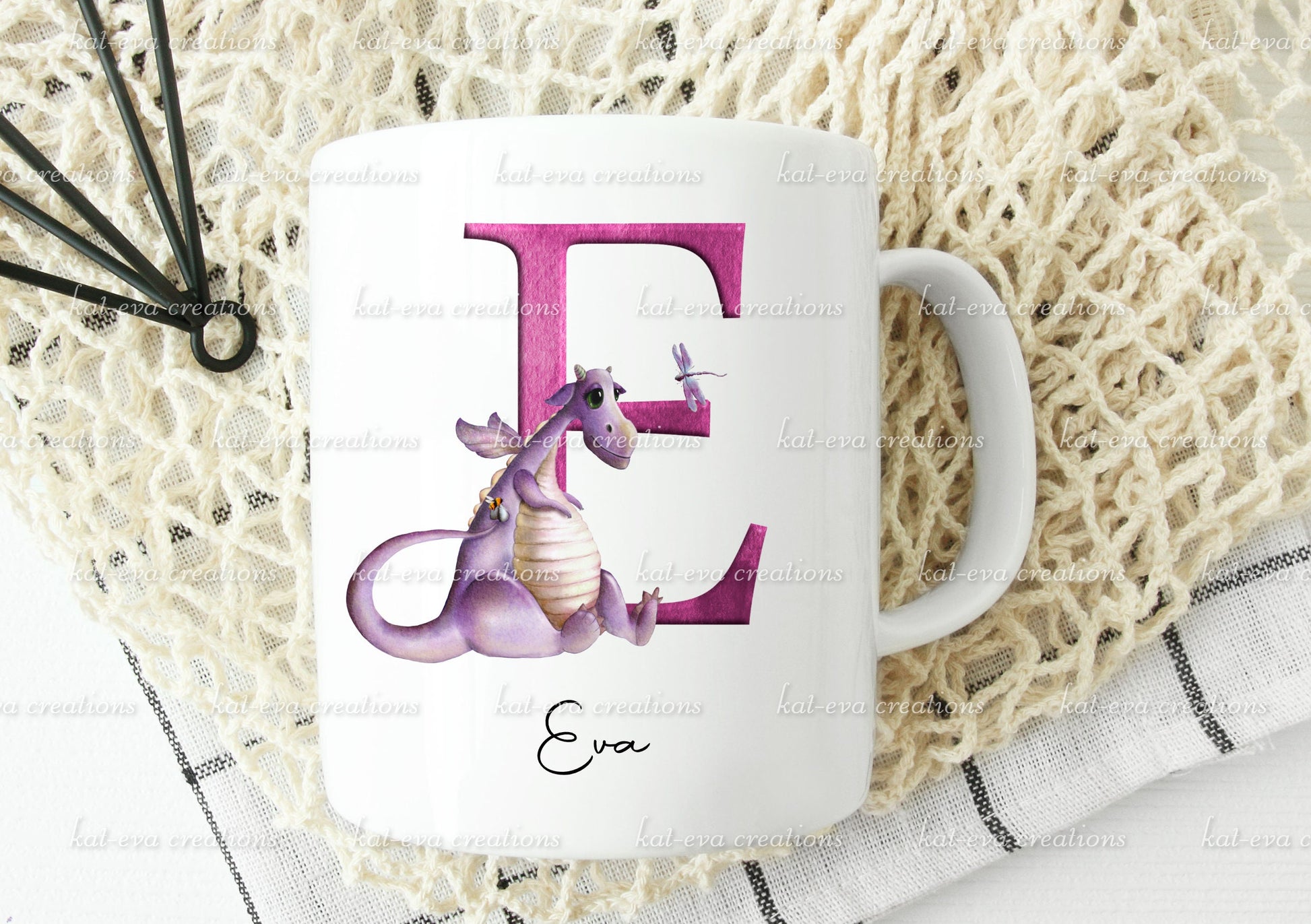 personalised initial dragon mug, available in pink or blue. ideal birthday or christmas gift