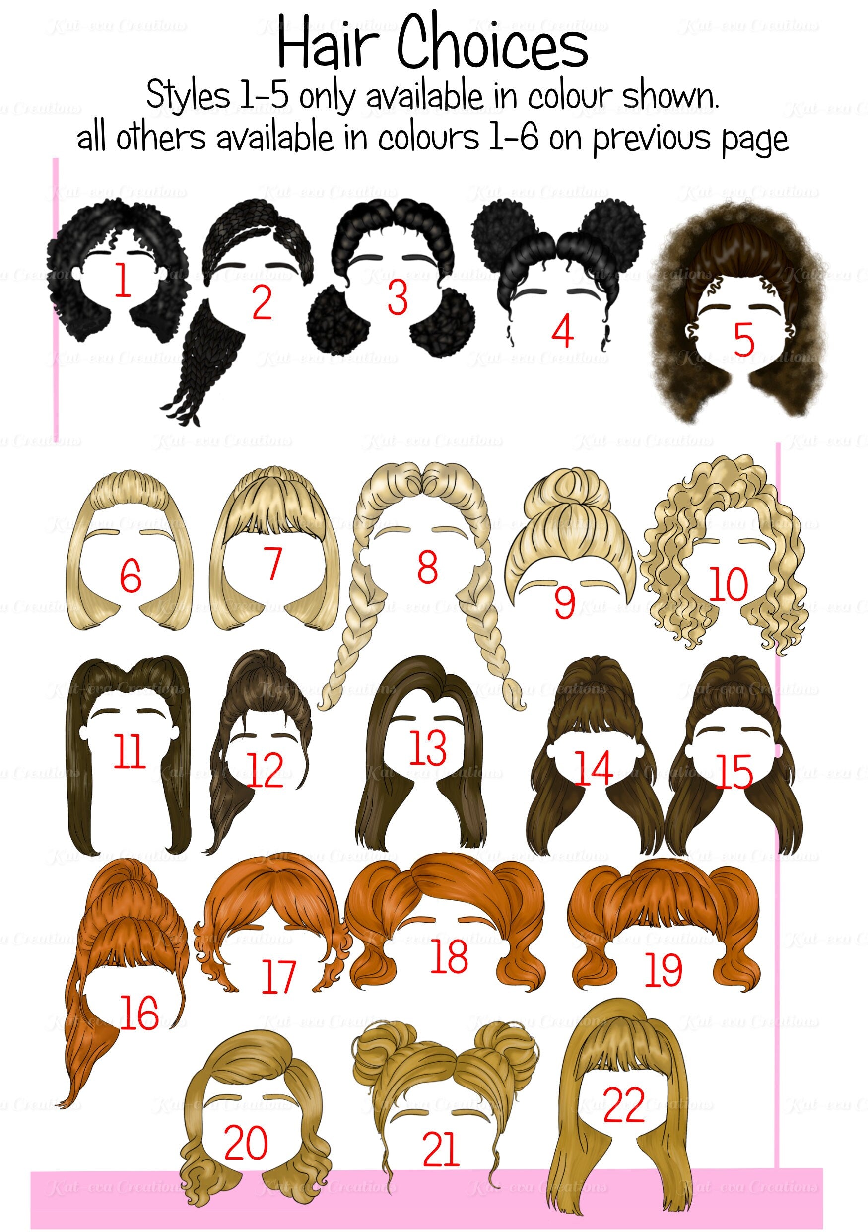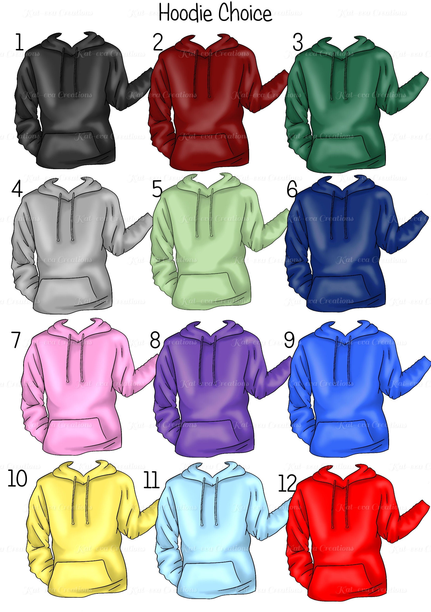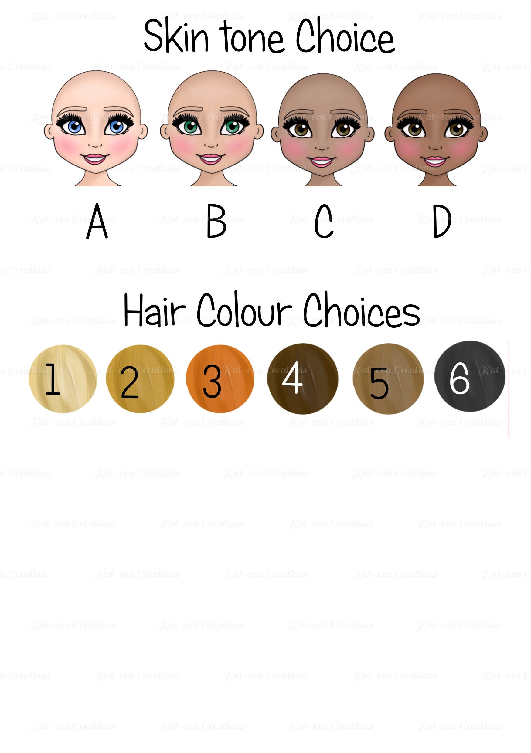 Choice of hair colour, hair style, skin tone, eye colour and hoodie