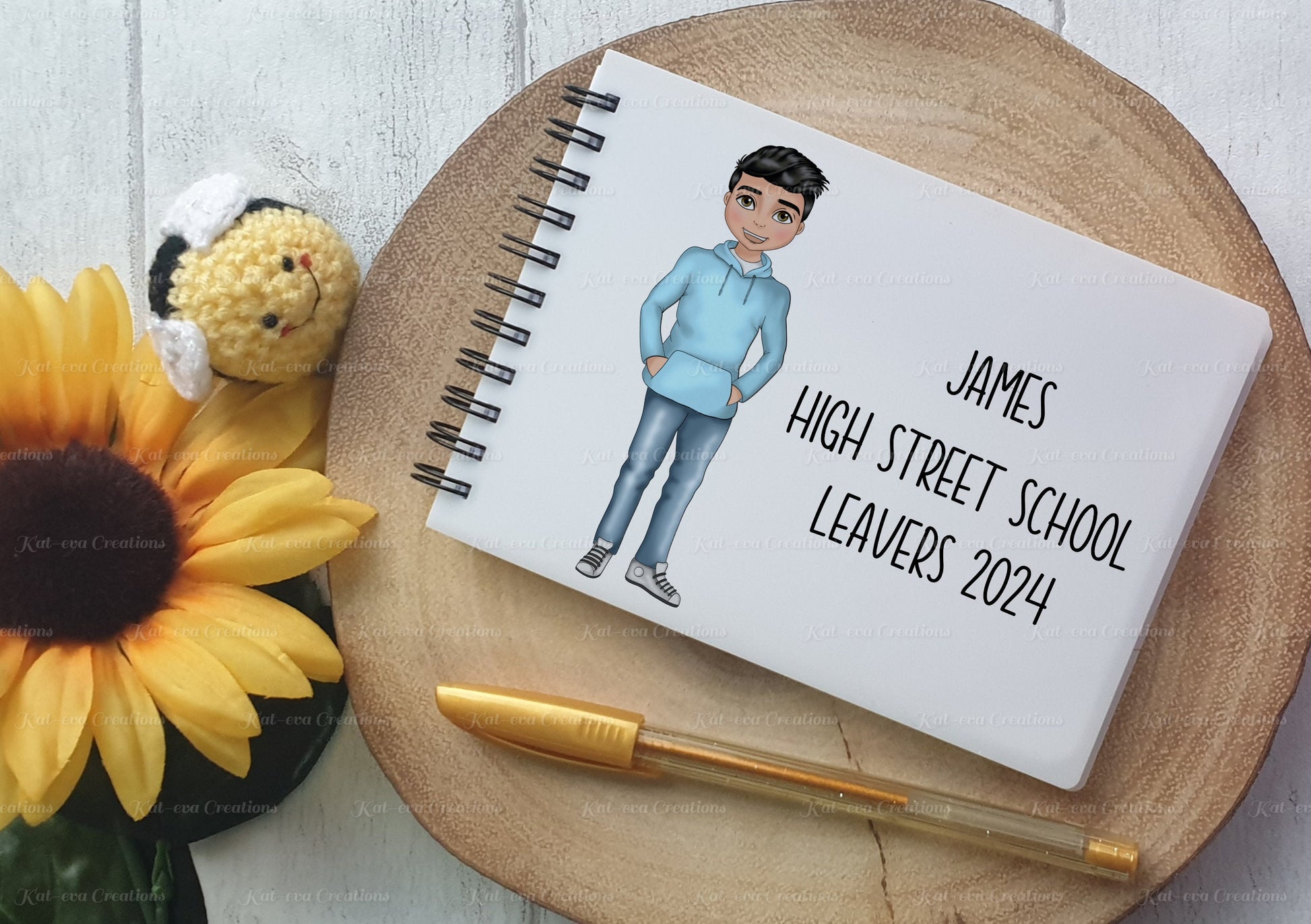 A6 leavers book Choice of hair colour, hair style, skin tone, eye colour and hoodie On checkout please state Hair colour and style Eye colour Hoodie colour Hoodie wording If this isnt stated on checkout, I will message once, and if no reply within 24 hours your order will be cancelled 60 sheets of plain paper inside these can include name and school name. boys books available in our etsy shop These are ideal for letting people sign or leave messages and create memories of your school years Please include personalisation details required on checkout.