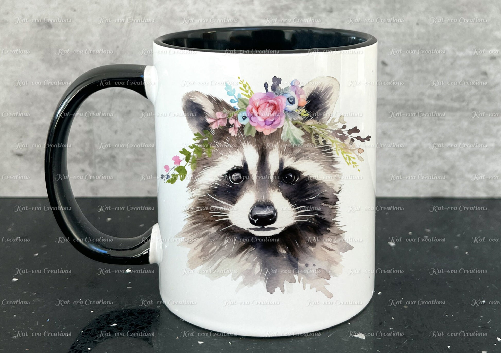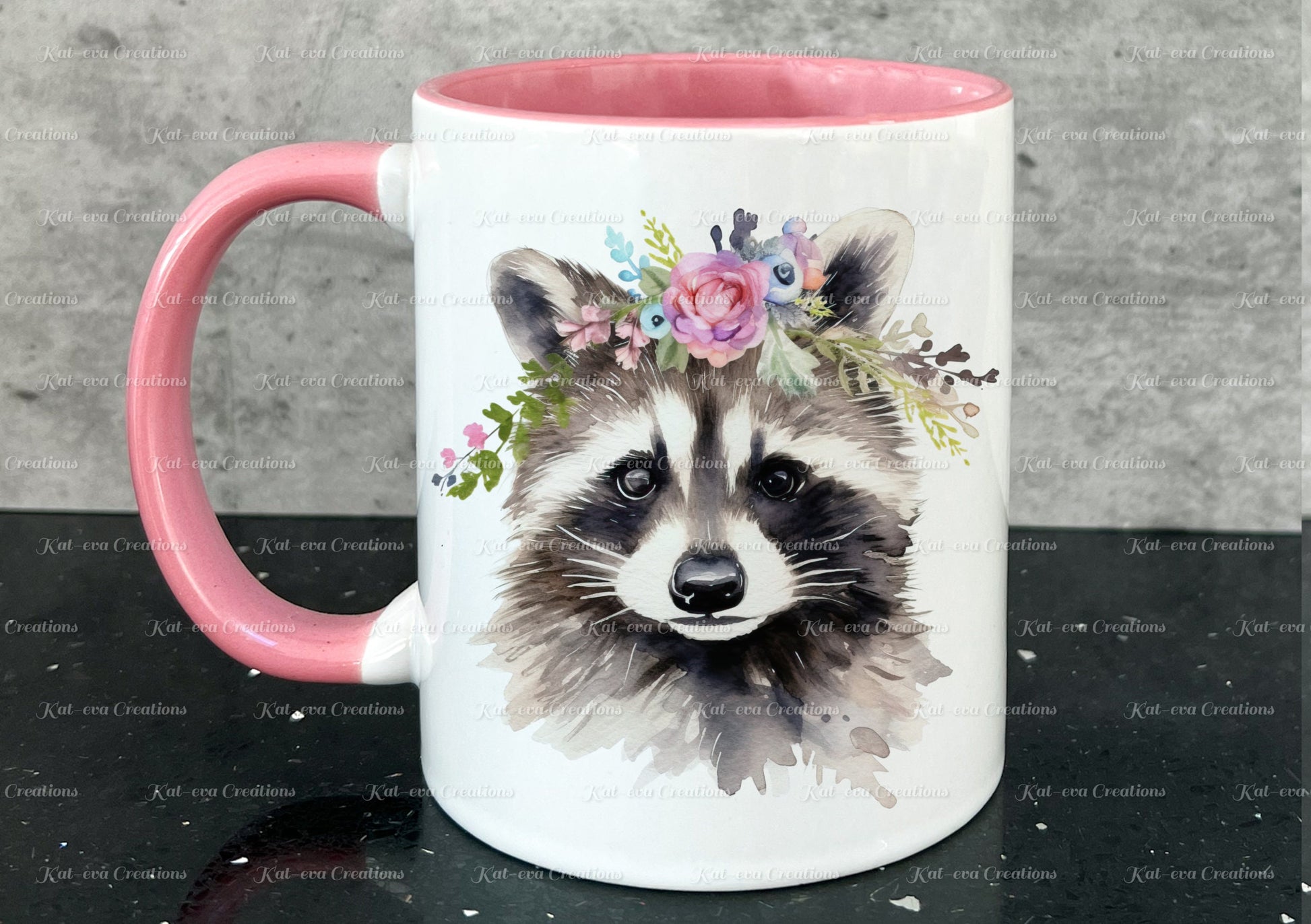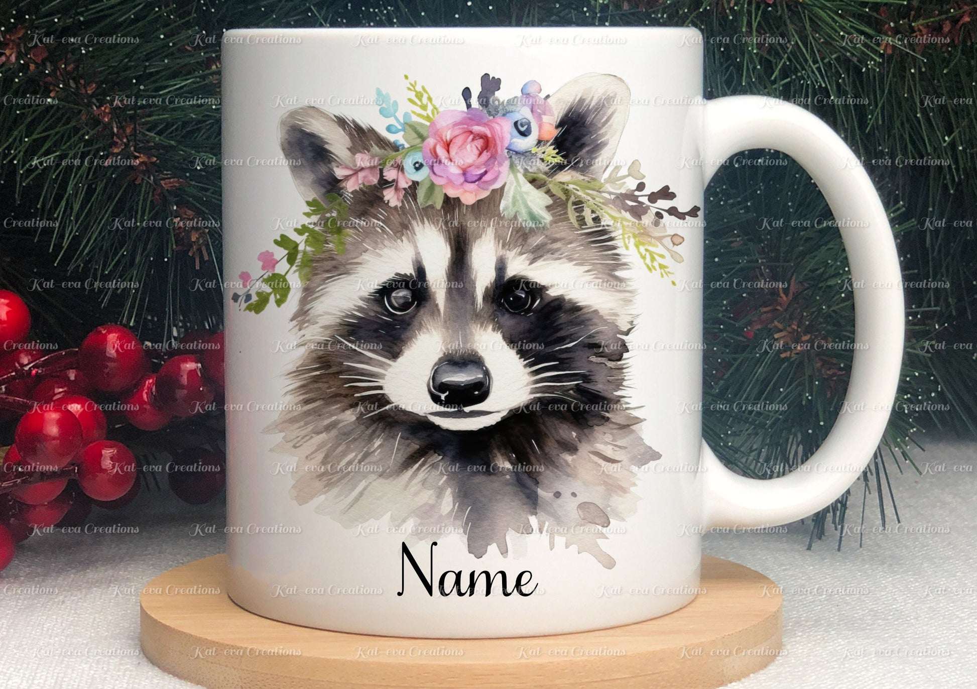 personalised racoon mug. Gorgeous Floral raccoon Cup. Ideal for birthday, secret santa, stocking filler or Christmas present