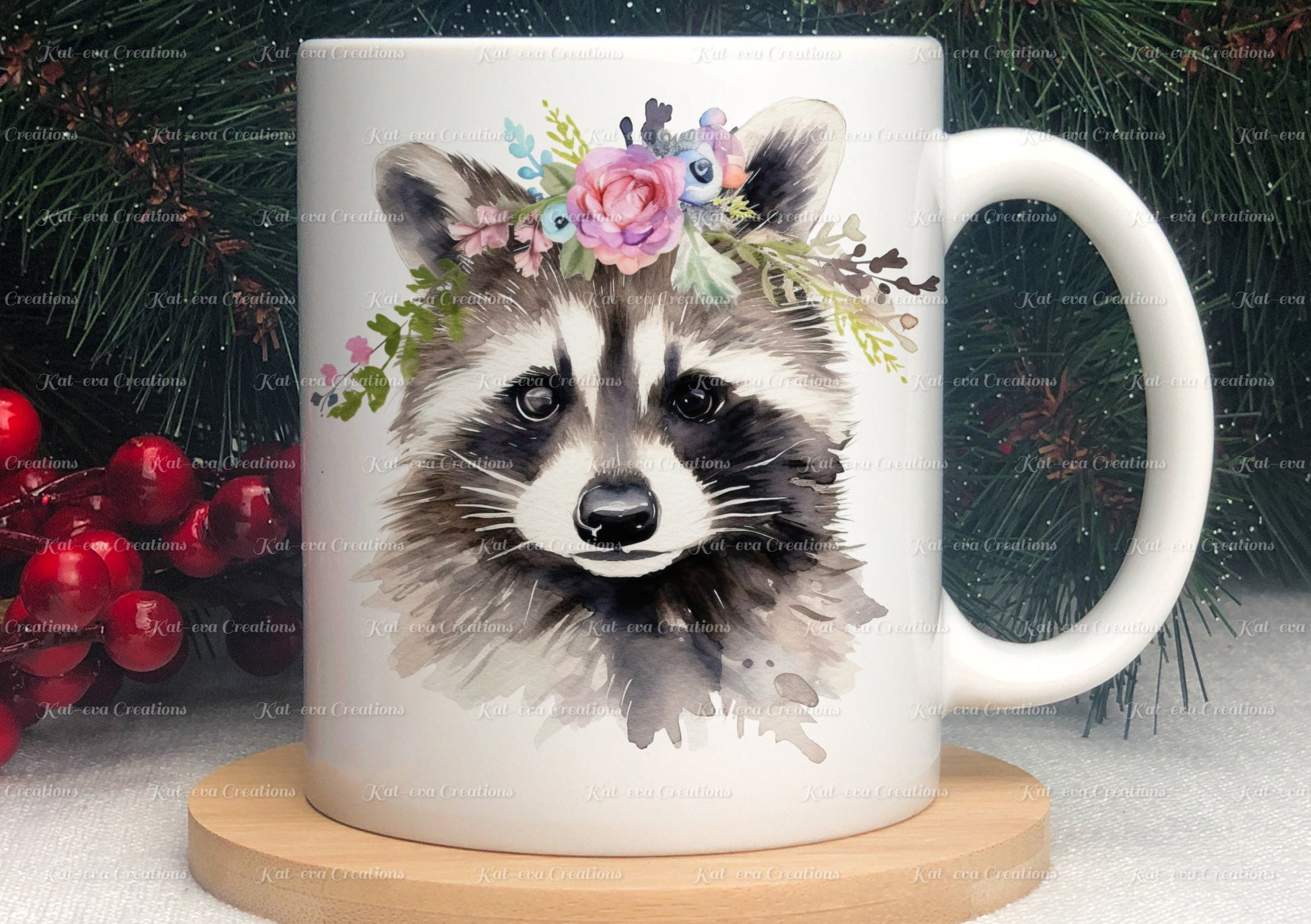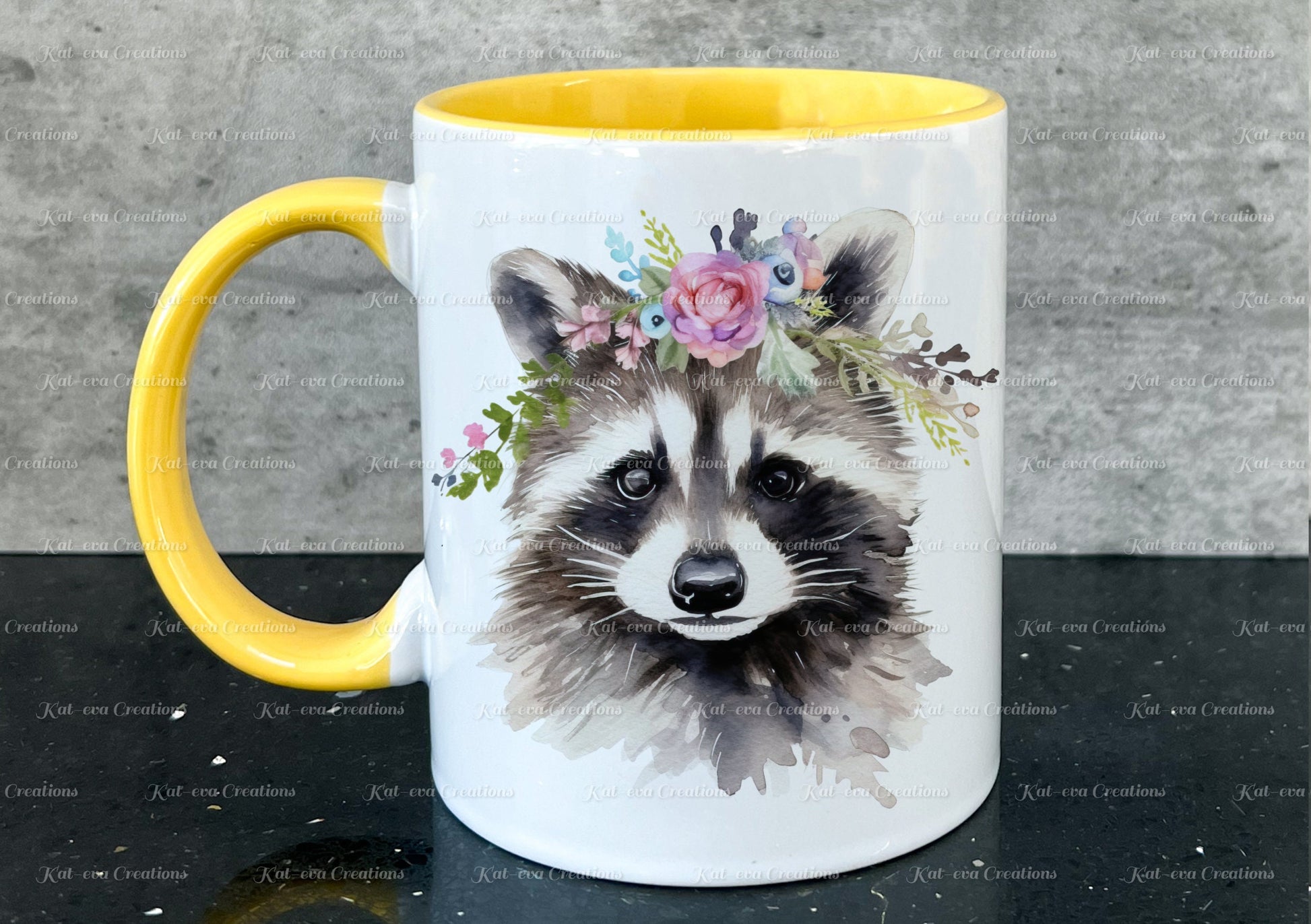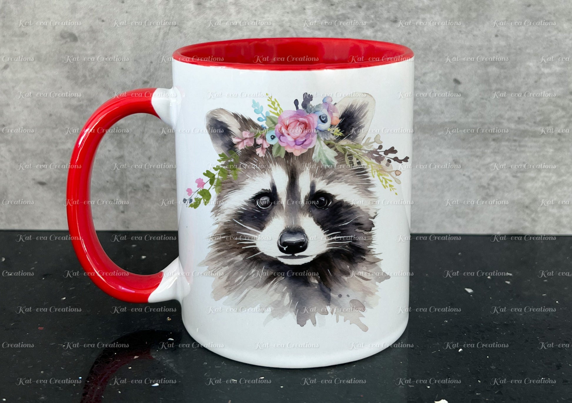 personalised racoon mug. Gorgeous Floral raccoon Cup. Ideal for birthday, secret santa, stocking filler or Christmas present