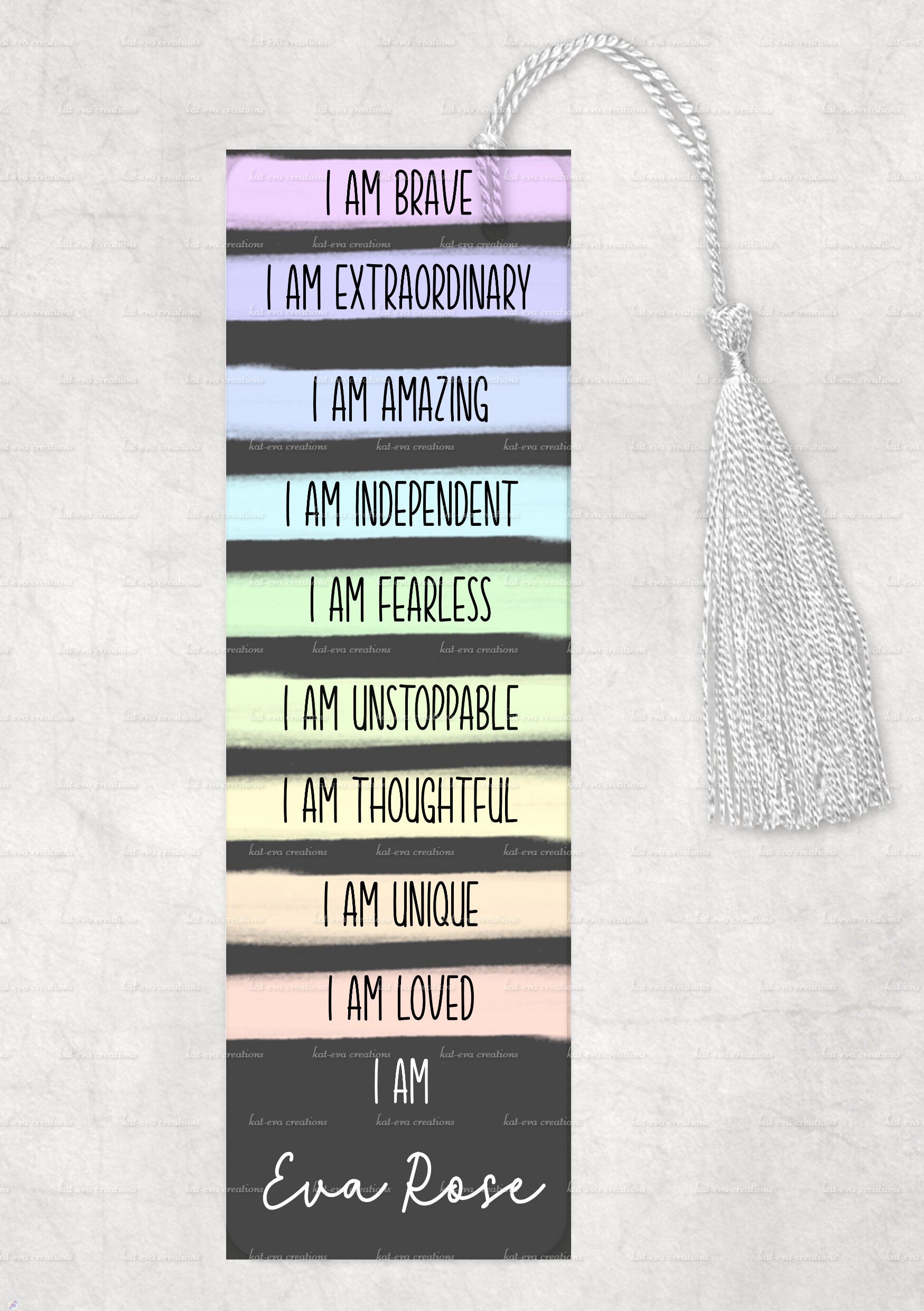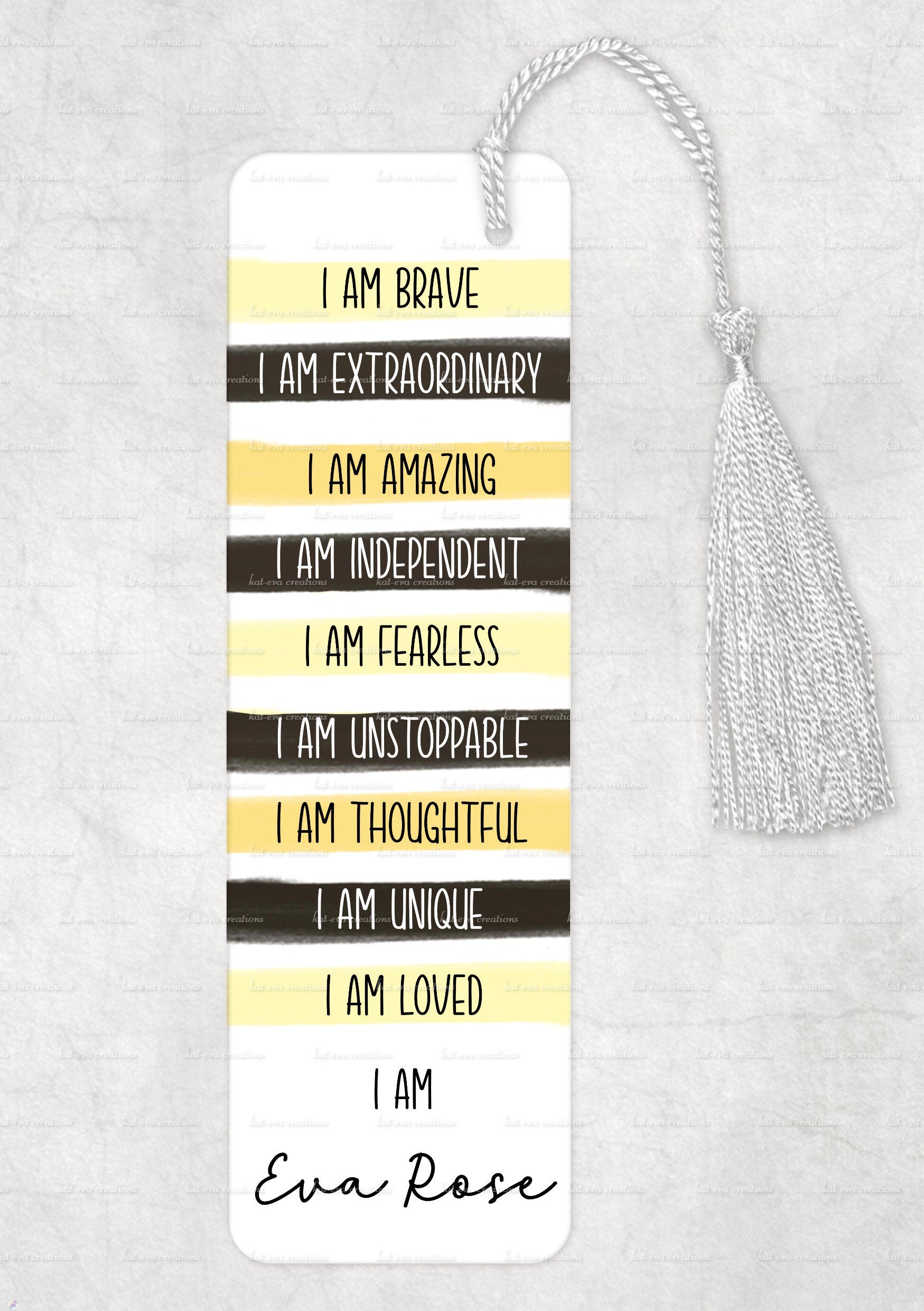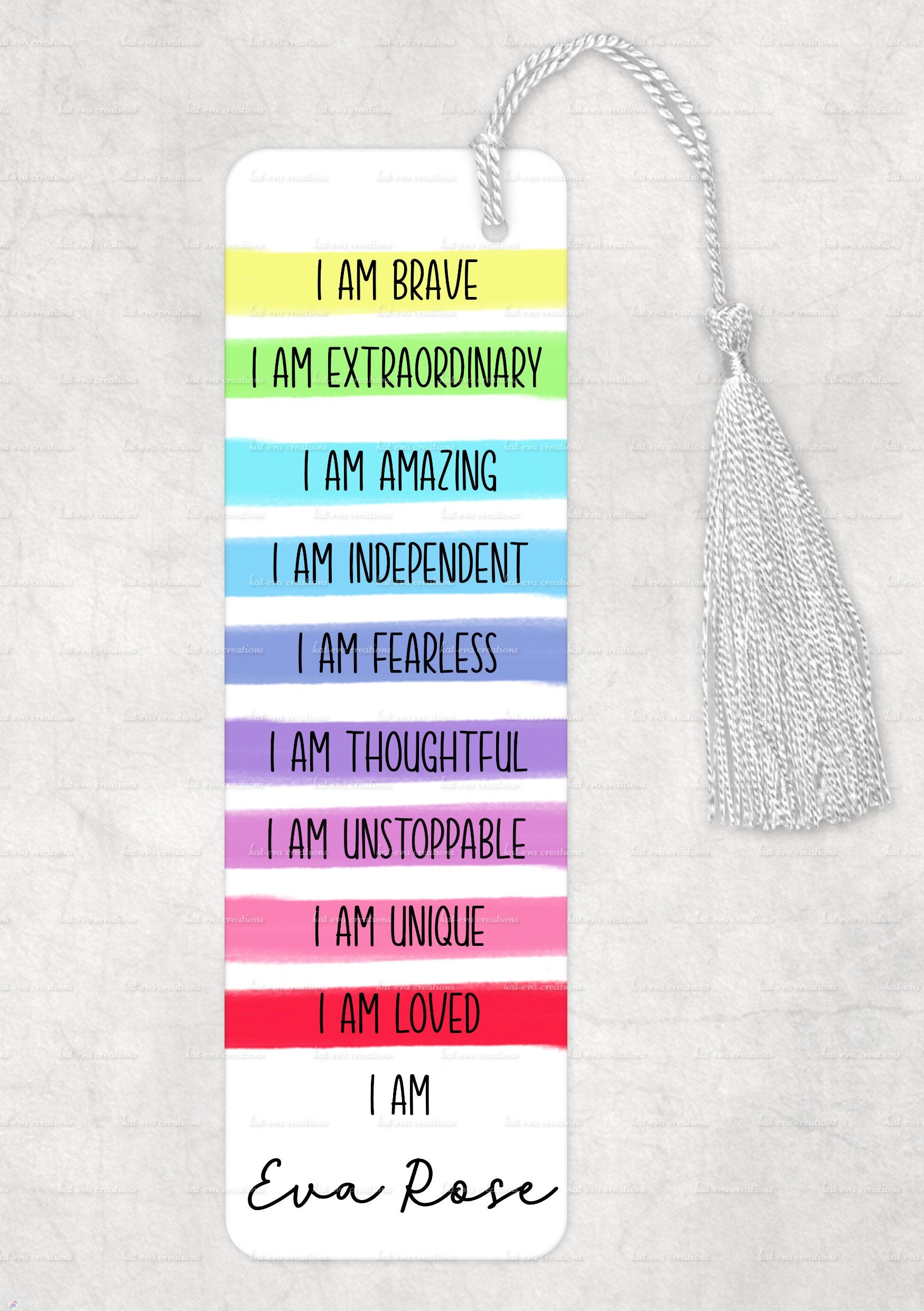 positive affirmation personalised bookmark. positivity, brave, extraordinary, amazing, independent, fearless, thoughtful, unique, loved