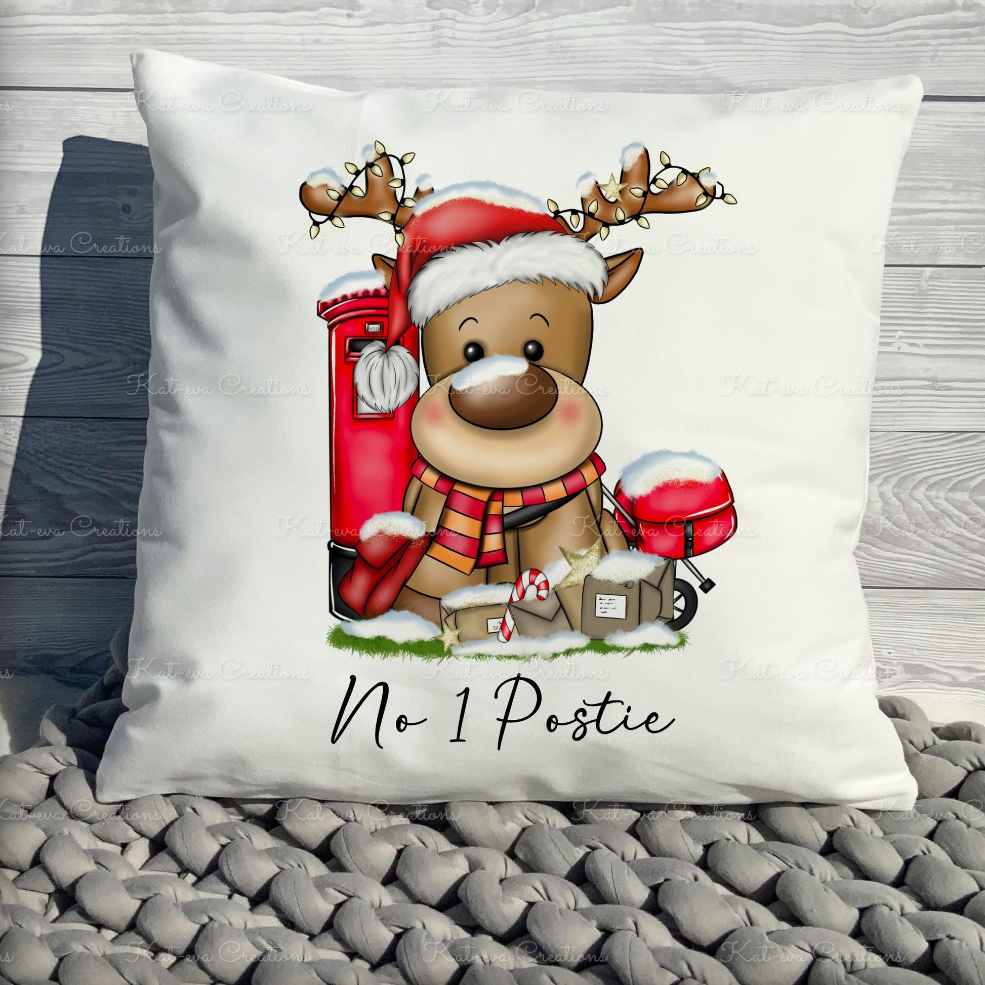 postman reindeer cushion. personalised postlady / postie cushion. ideal christmas or secret santa gift or as a thank you present