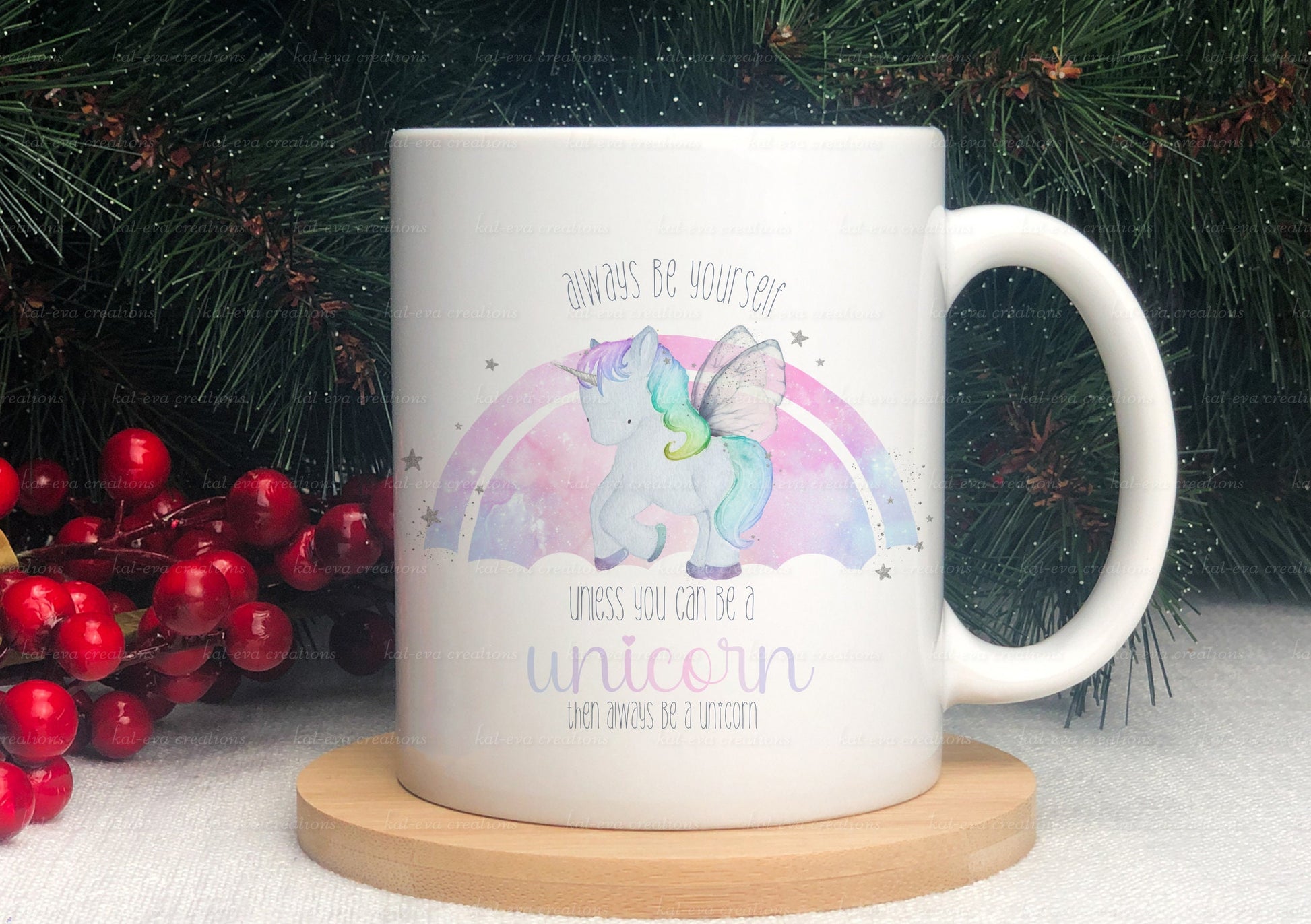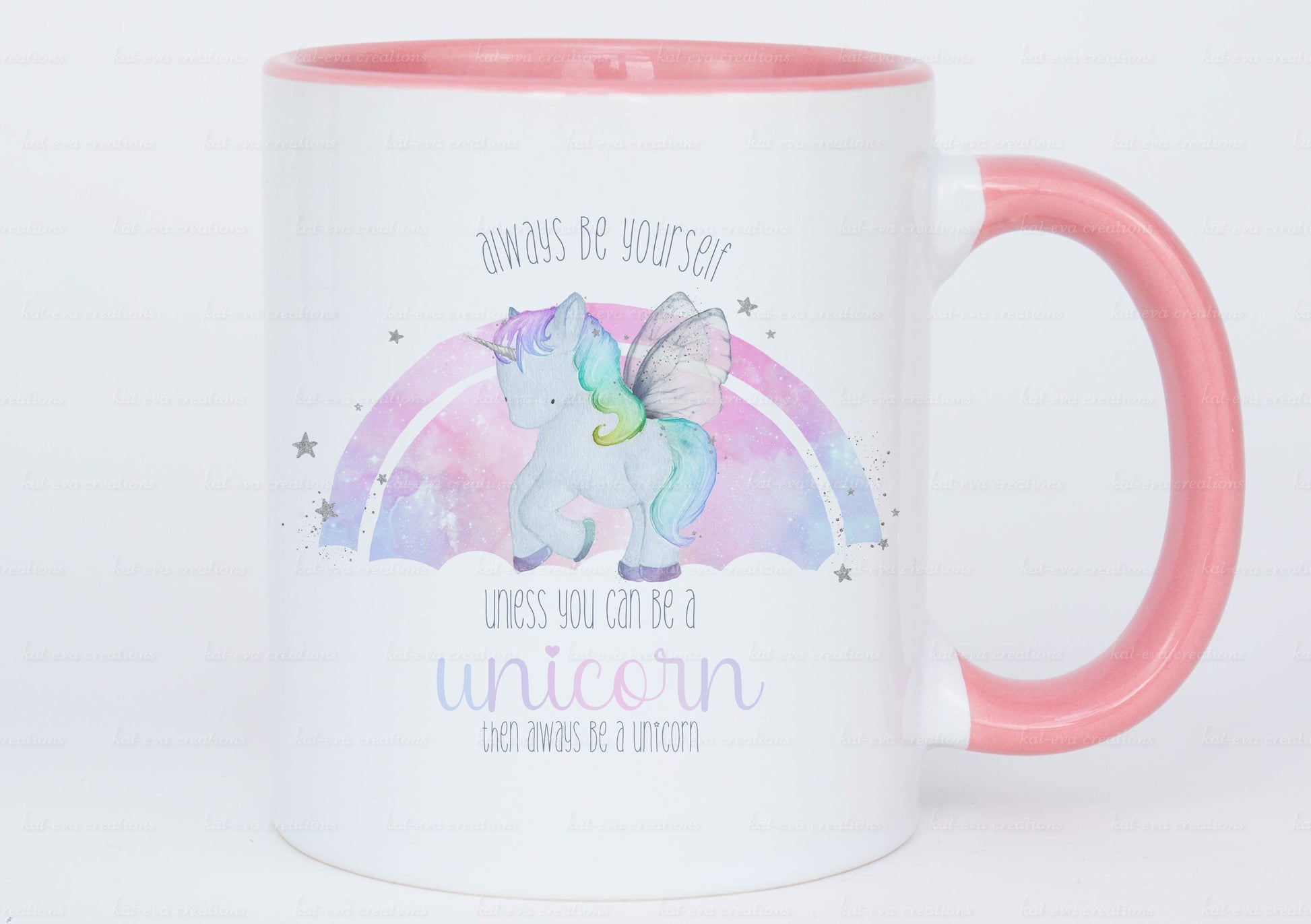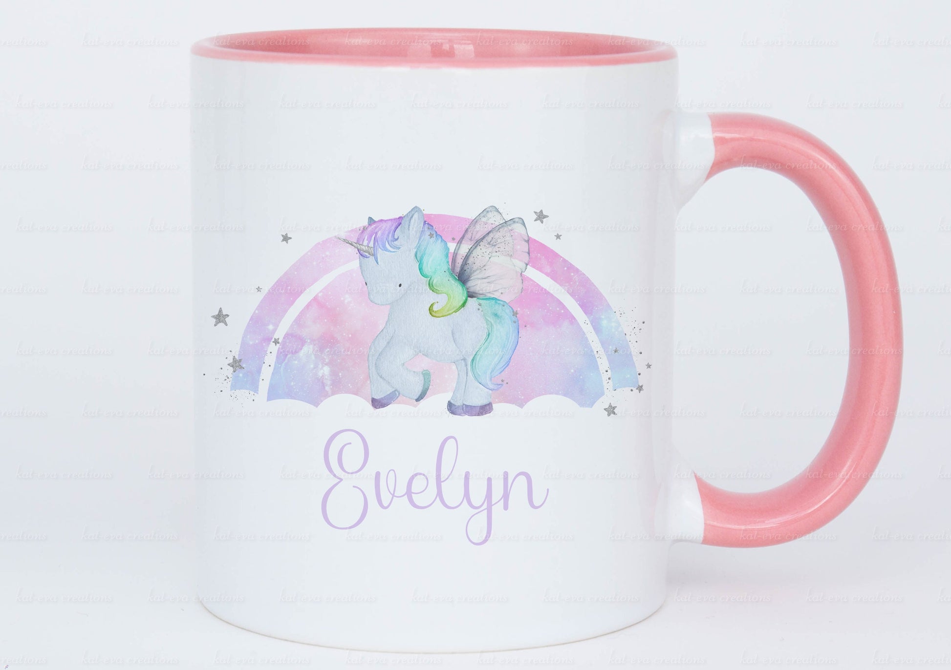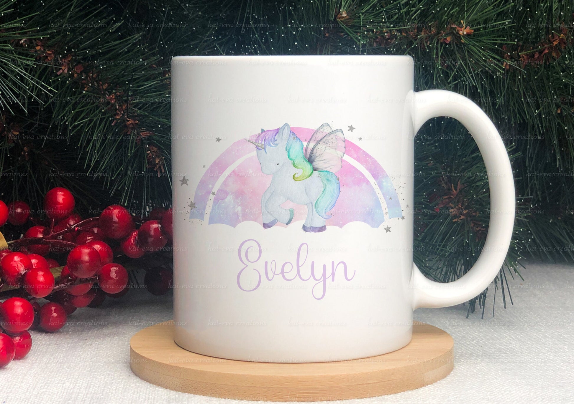 Rainbow unicorn mug. Can be personalised with wording of your choice. ideal for birthday, christmas or back to school