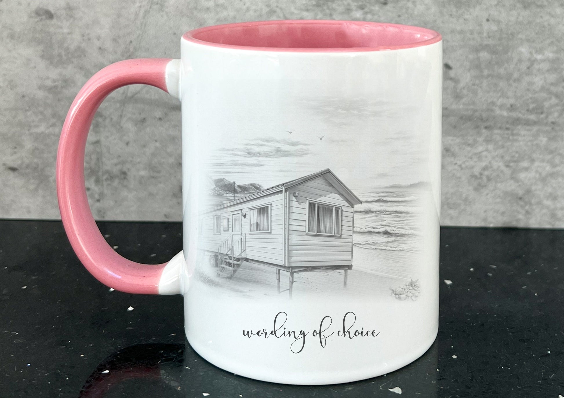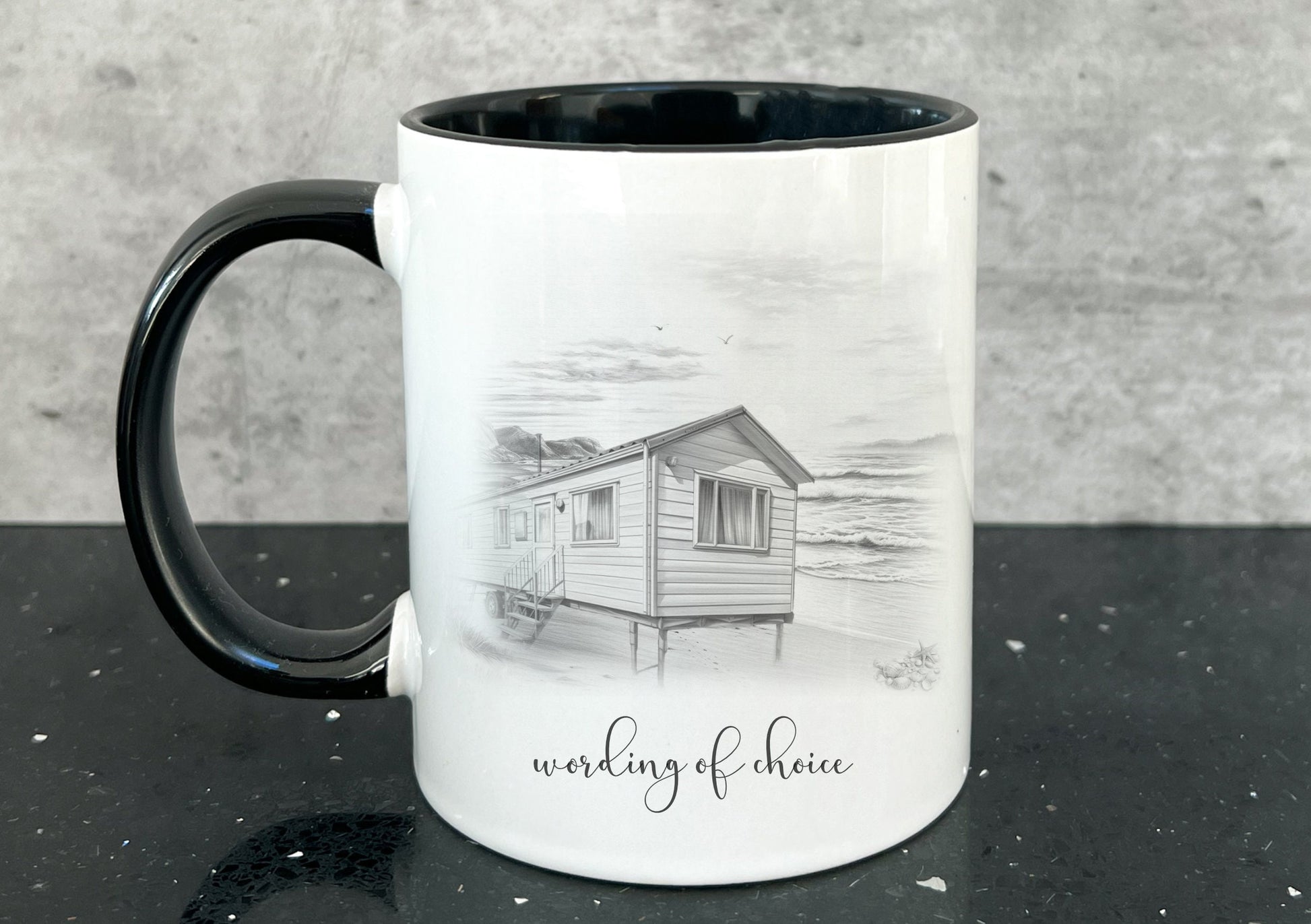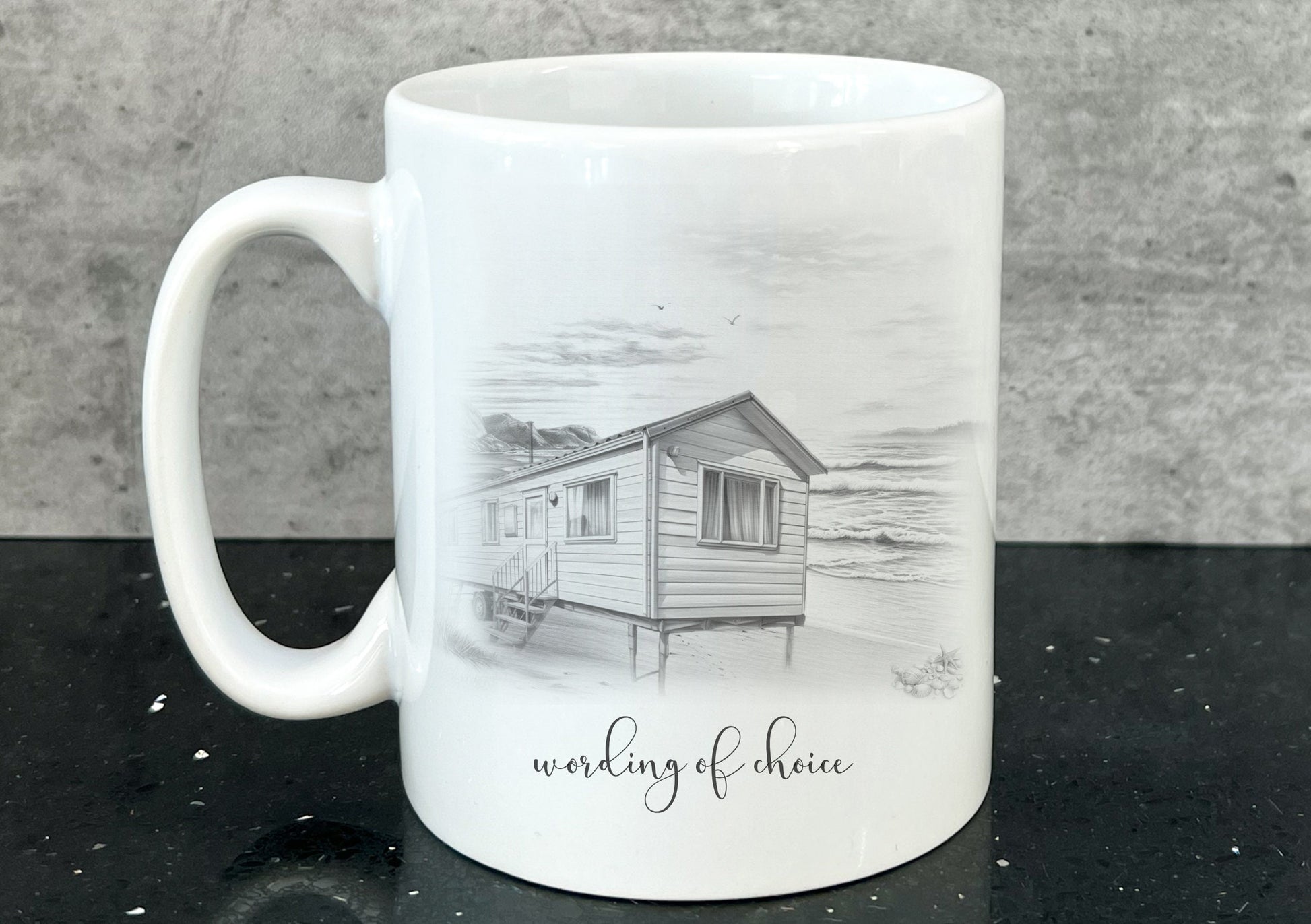 static caravan mug. personalised static caravan cup. Camping and caravanning gift. summer holiday present