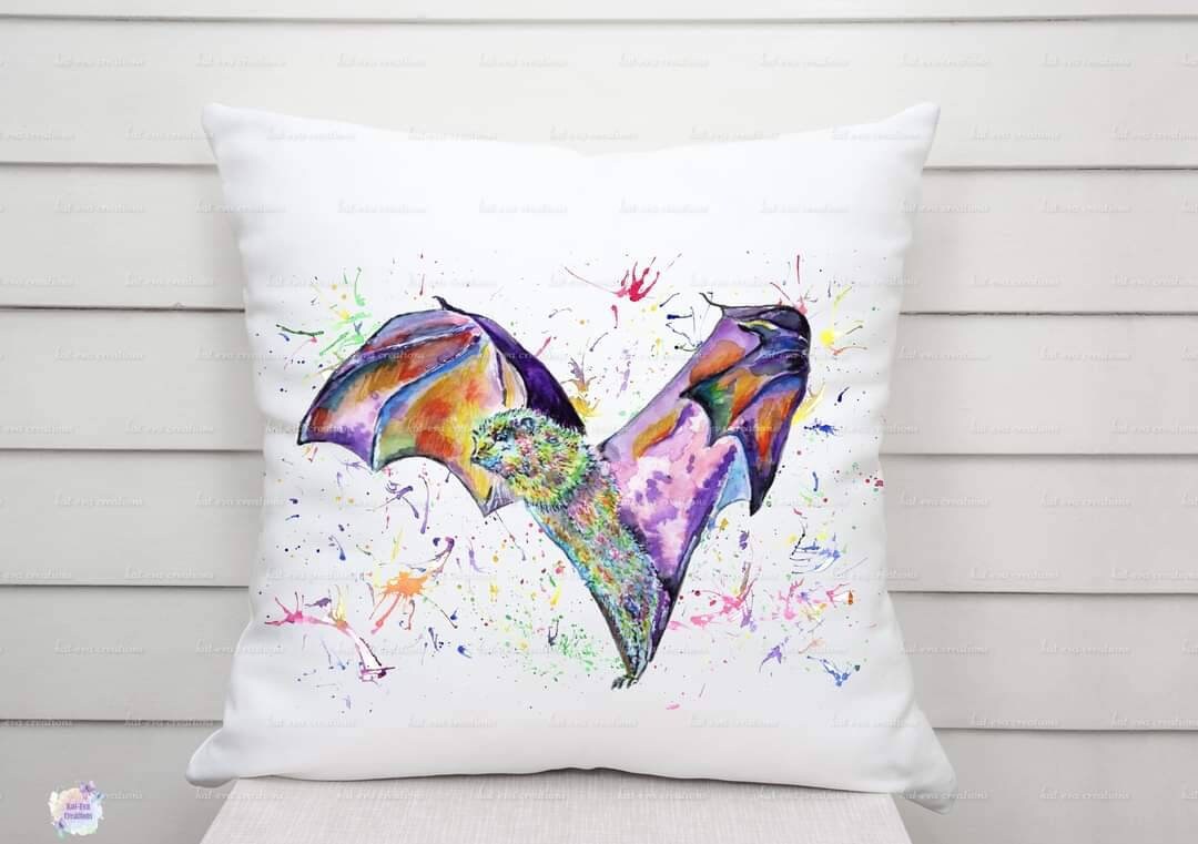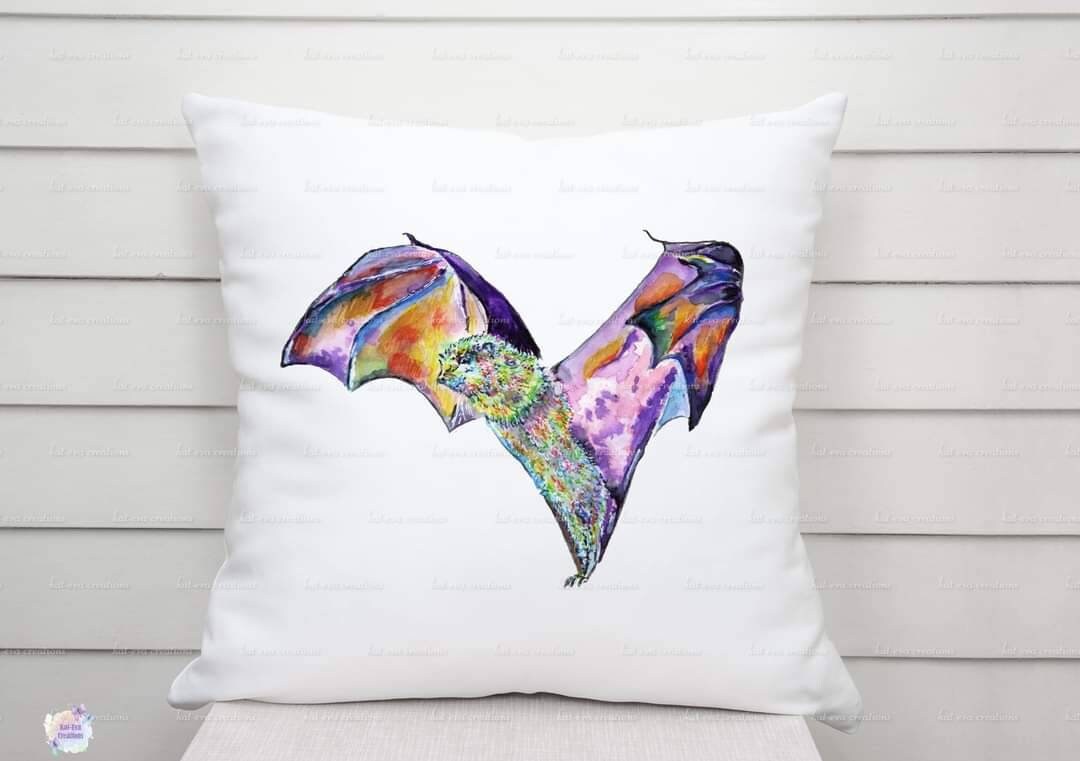 Beautiful bat cushion can be made with or without splatter. And name or message can be added as well